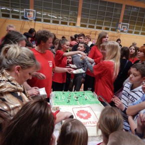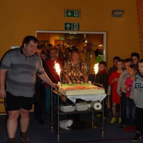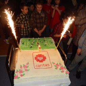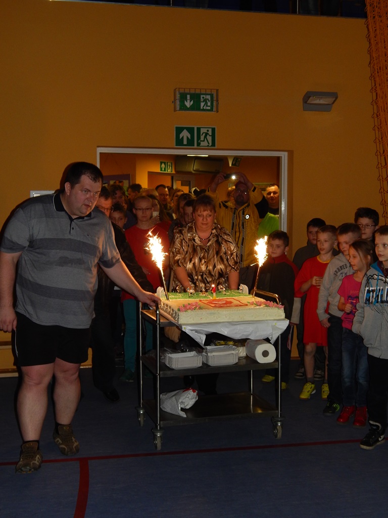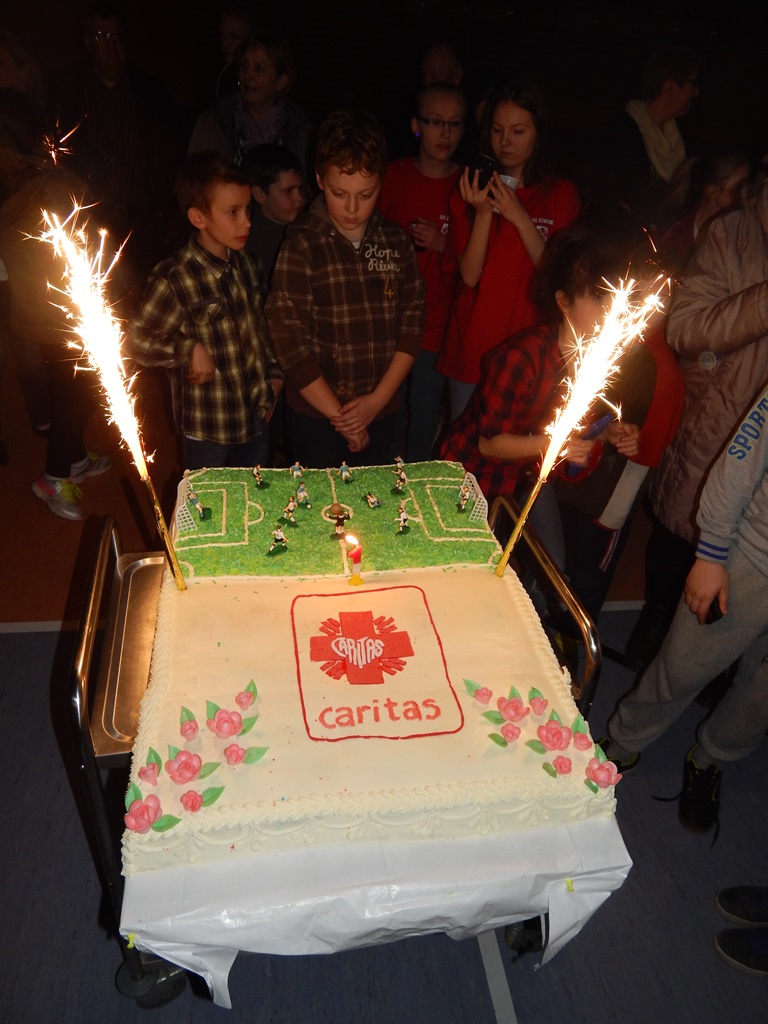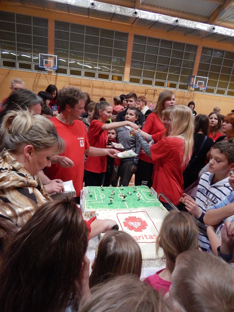 Ogromny, przepiękny tort urodzinowy, przy dźwiękach fanfar, na płytę Hali wprowadził Wójt Gminy Jedwabno. Tort upieczony przez panią Agnieszkę Skwiot prezentował się bardzo efektownie. Na jednej jego połówce przedstawiona była płyta boiska do piłki nożnej, a na drugiej logo Caritas. Uczestnicy festynu delektowali sie również pysznym gulaszem przygotowany przez Stowarzyszenie Koło Gospodyń Wiejskich w Szuci.