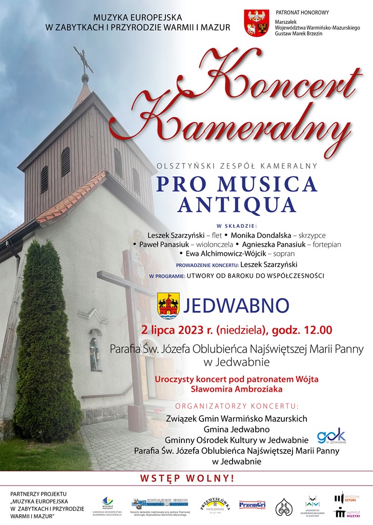 Zapraszamy na koncert olsztyńskiego zespołu kameralnego PRO MUSICA ANTIQUA, który odbędzie się 2 lipca o godz. 12:00 (tuż po Uroczystej Mszy Świętej) w Parafii Św. Józefa Oblubieńca Najświętszej Marii Panny w Jedwabnie. Zespół zaprezentuje utwory od baroku do współczesności. Koncert zrealizowany w ramach projektu „Muzyka Europejska w Zabytkach i Przyrodzie Warmii i Mazur”.