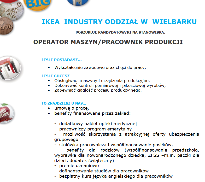 IKEA INDUSTRY Oddział w Wielbarku poszukuje kandydatów/ki na stanowiska: operator maszyn/pracownik produkcji. Zainteresowane osoby, prosimy o złożenie aplikacji na adres [email protected] z dopiskiem w tytule: OPERATOR.