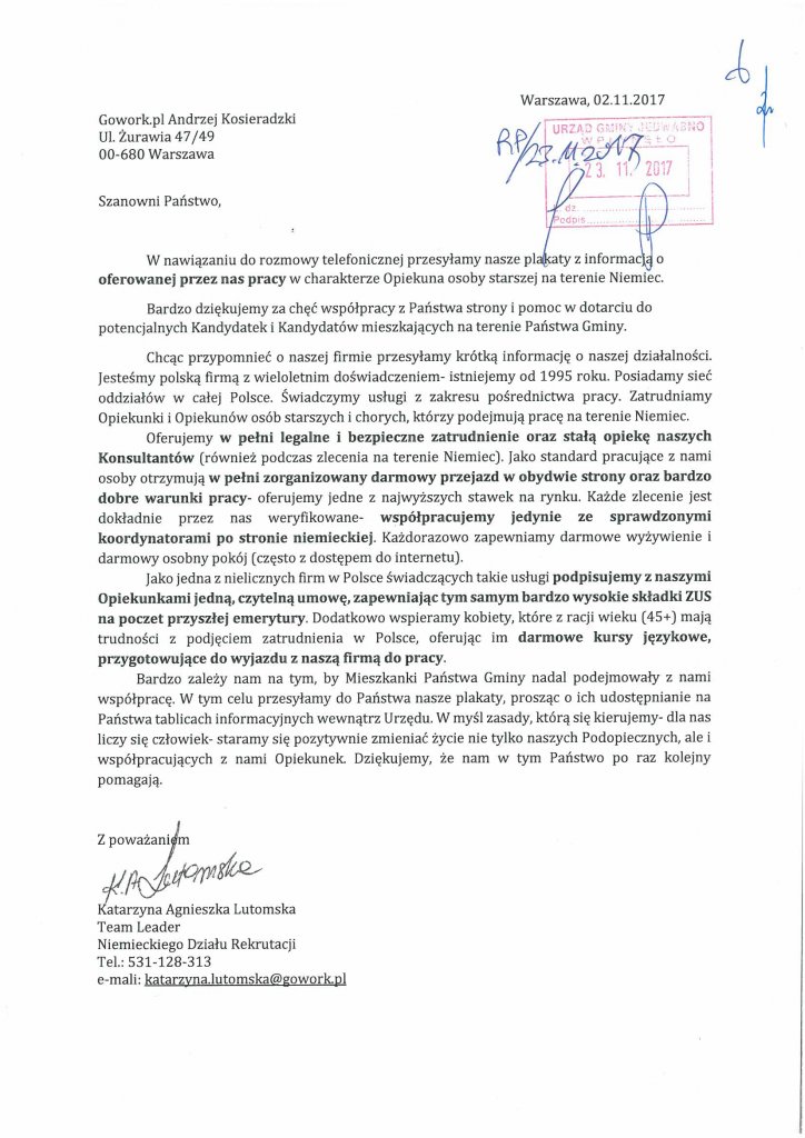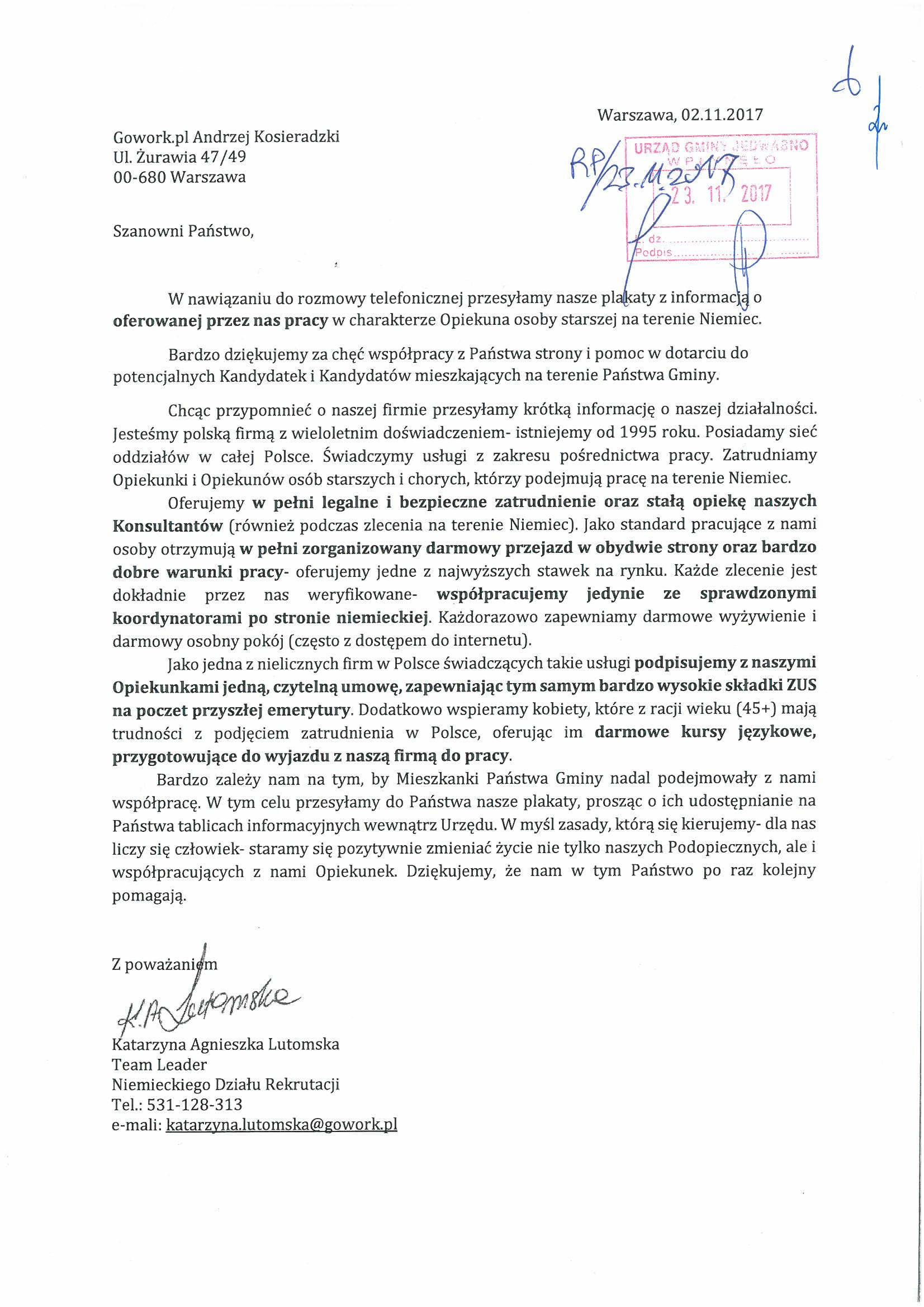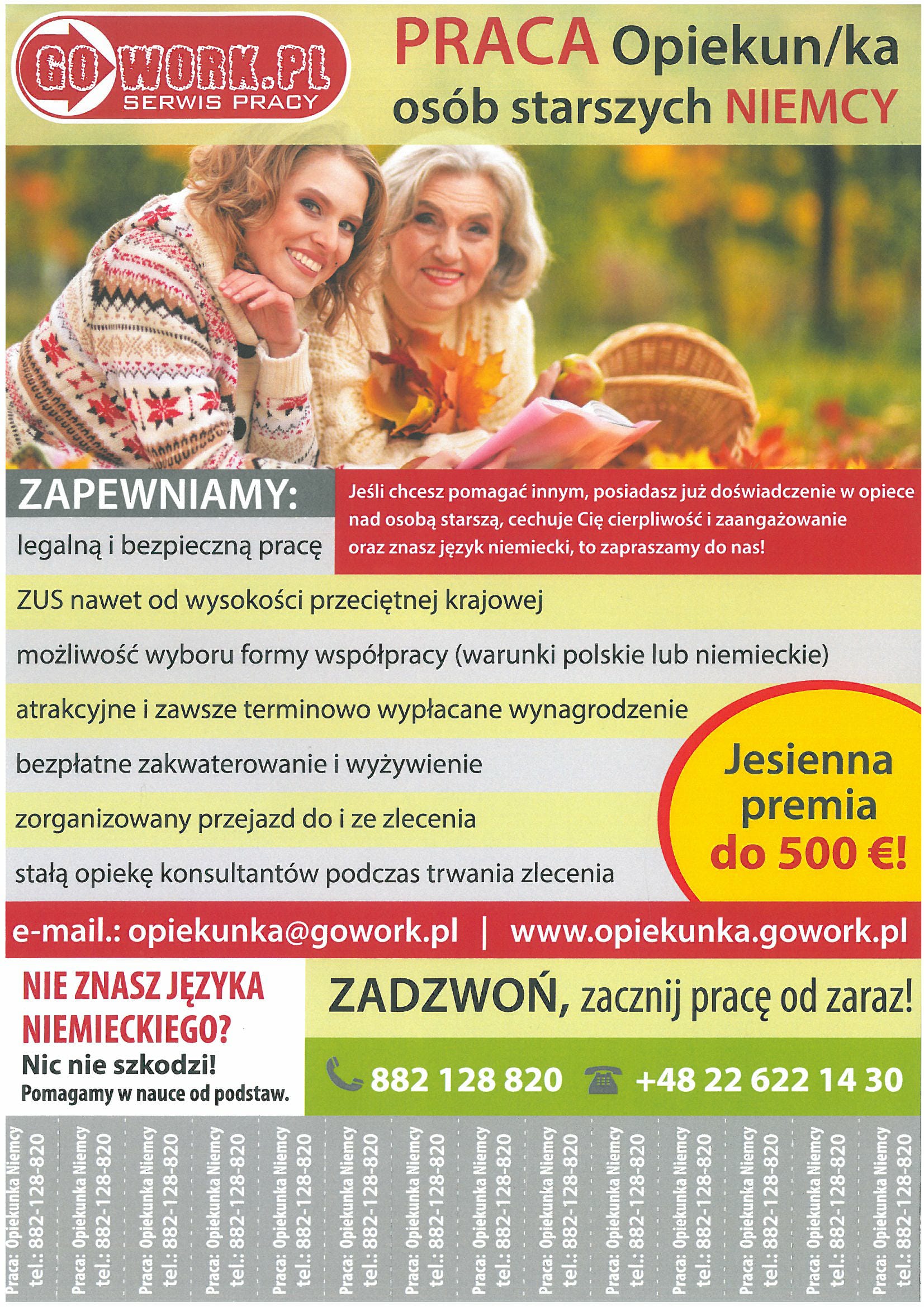 Firma z wieloletnim doświadczeniem w organizowaniu wyjazdów dla Opiekunek i Opiekunów osób starszych do Niemiec. Pośrednictwem pracy zajmuje się od 1995 roku. Posiadają sieć oddziałów w całej Polsce. Świadczą usługi z zakresu pośrednictwa pracy. Zatrudniają Opiekunki i Opiekunów osób starszych i chorych, którzy podejmują pracę na terenie Niemiec.
